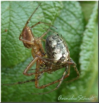 Die Herbstspinne ist wahrscheinlich die häufigste Radnetzspinne in unseren Breiten. Sie lebt an Wegrändern und auf Wiesen. Die Paarungszeit liegt im Spätsommer und im Herbst. Ich konnte das Paarungsverhalten gut beobachten. Das Weibchen sitzt oft am Netzrand, wartend auf Beute. Das /die Männchen warte(t)n dort in der Nähe auf ihre Chance, dem Weibchen nahe zu kommen. Dem Weibchen kann das Männchen erst näher kommen, sobald sich Beute im Netz verfängt. Das schnellste Männchen überwältigt die Beute und überbringt sie dann als "Hochzeitsgeschenk" an die Auserwählte. Akzeptiert das Herbstspinnenweibchen das Geschenk, beginnt sie es zu fressen. Das Männchen nähert sich vorsichtig, trommelt immer wieder, sich von hinten nähernd, auf den Hinterleib des Weibchens. Bleibt das Weibchen nach mehrmaligem betrommeln ruhig, kann es zur Paarung kommen. Zur Kopulation begibt sich das Männchen (zur Abgabe des Spermienpakets) unter das Weibchen, welches dazu die Malzeit unterbricht.